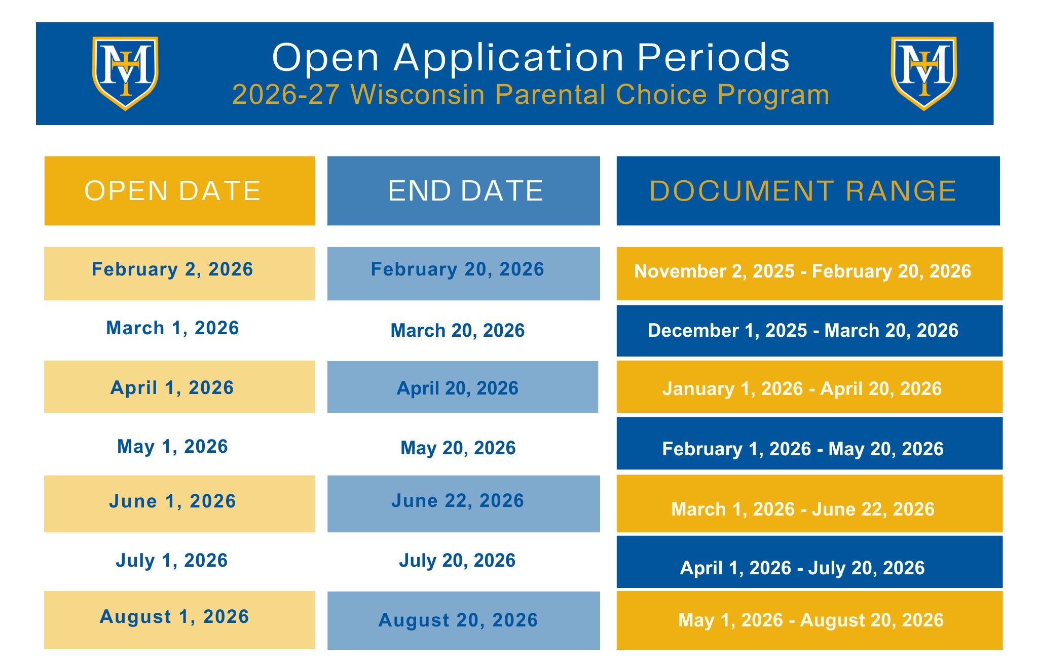 Many families are surprised to learn they may qualify for free tuition at McDonell Area Catholic Schools. The Wisconsin Parental Choice Program provides financial support to eligible families, allowing students to attend MACS at little or no cost based on household income. As you can see in the chart below, applications are accepted for roughly the first 20 days of each month.