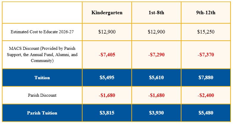 McDonell Area Catholic Schools (MACS) is committed to financial transparency and affordability for families. Tuition, fees, and financial aid for the 2026-27 school year are managed through FACTS Financial, FACTS Tuition Management, and FACTS Grant & Aid. The following outlines tuition costs, available discounts, and options for financial assistance.